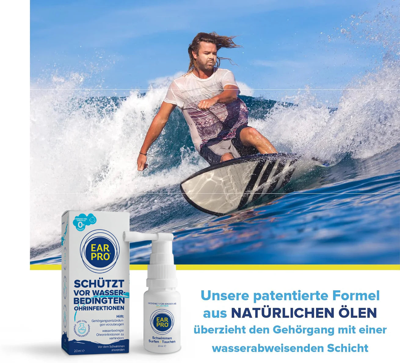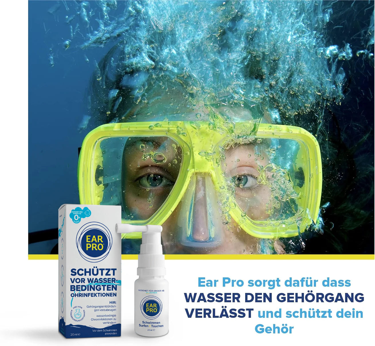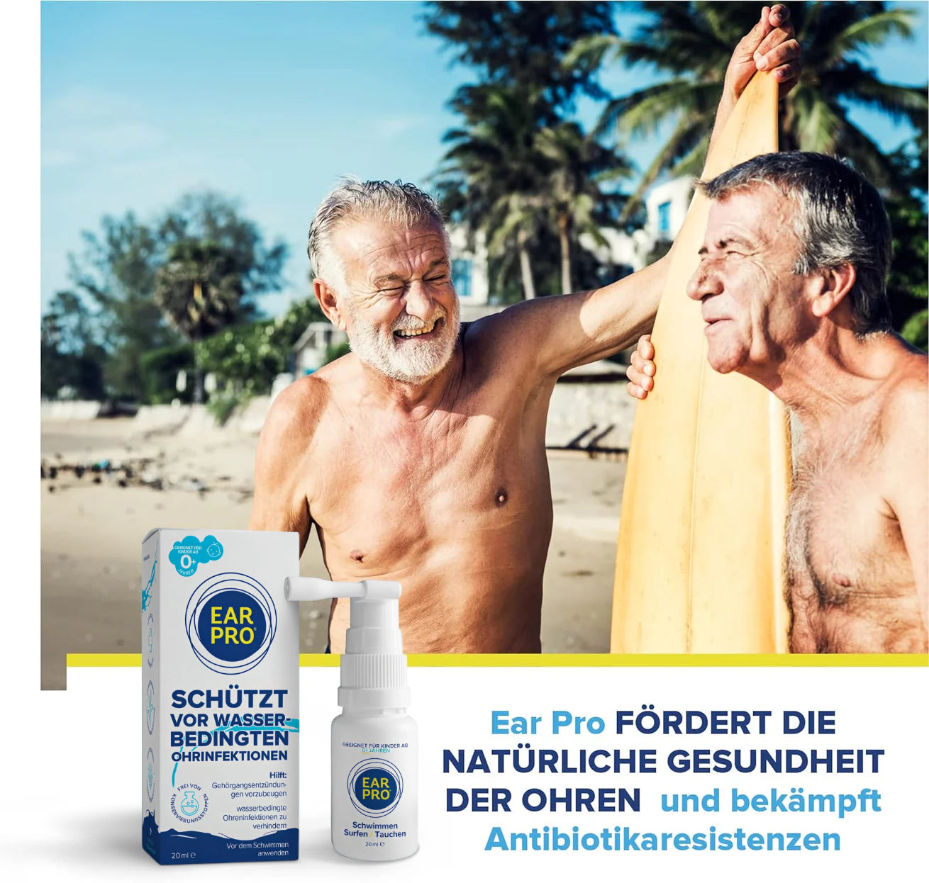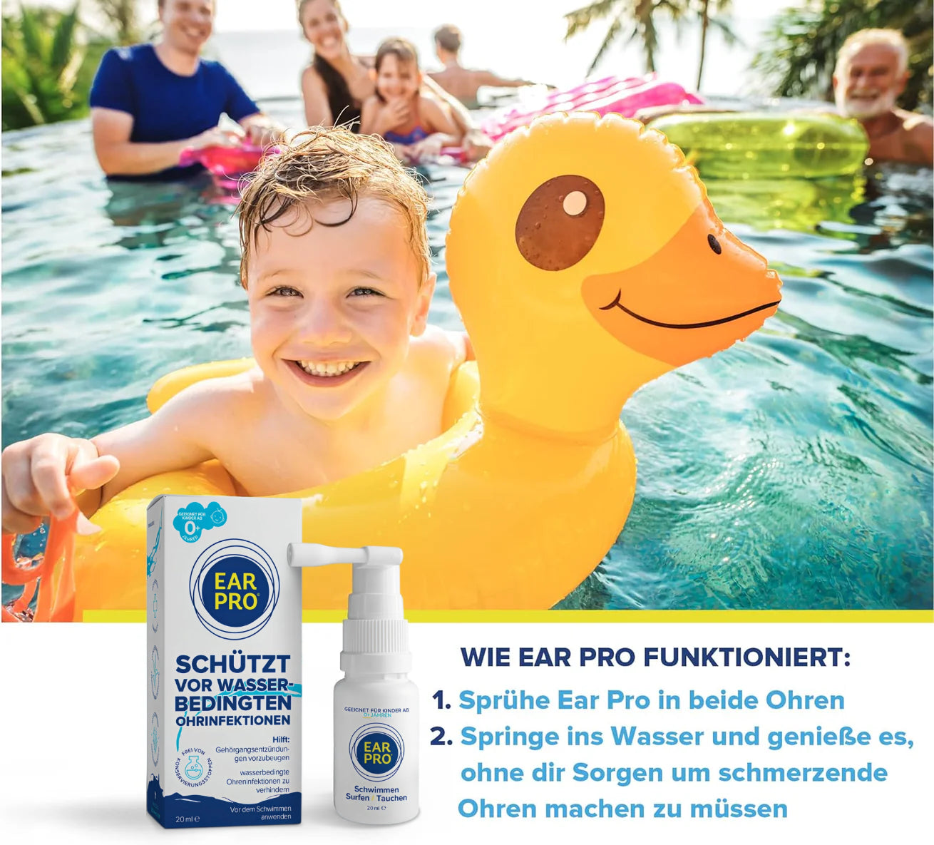 Warum nicht vorbeugen statt behandeln? Ear Pro zielt darauf ab, Ihre Ohren auf natürliche Weise vor Beschwerden und möglichen Infektionen zu schützen. Einfach vor dem Schwimmen in jedes Ohr sprayen könnte helfen, Antibiotika und ungewollte Krankenhausbesuche zu vermeiden.